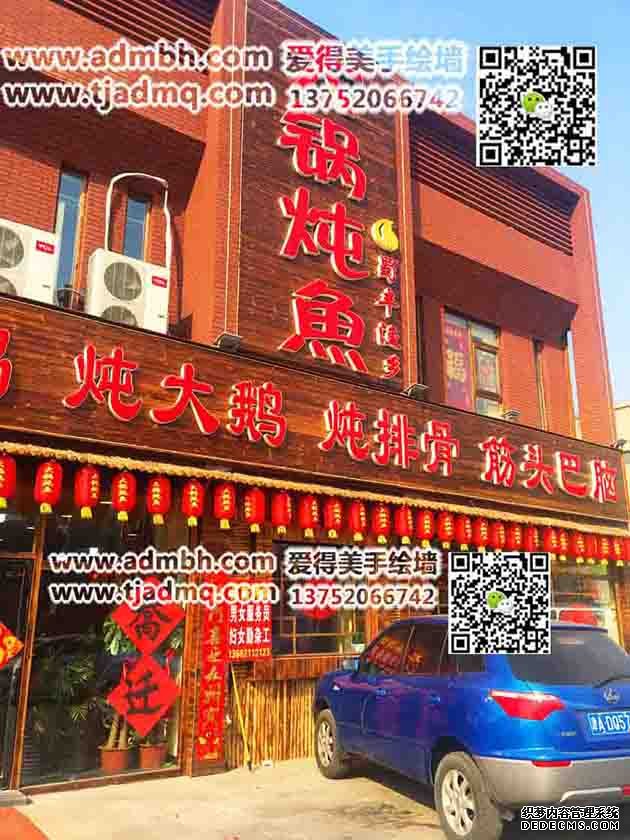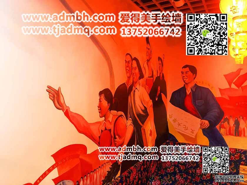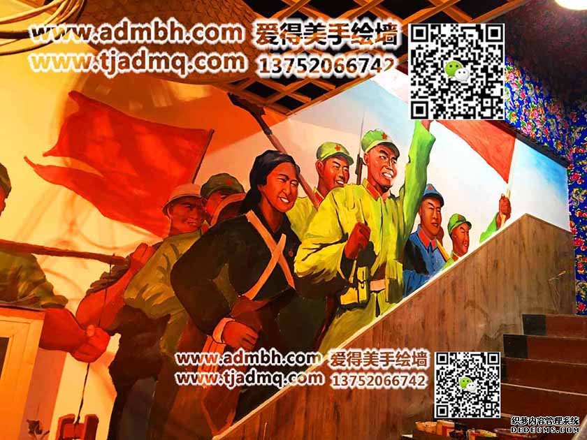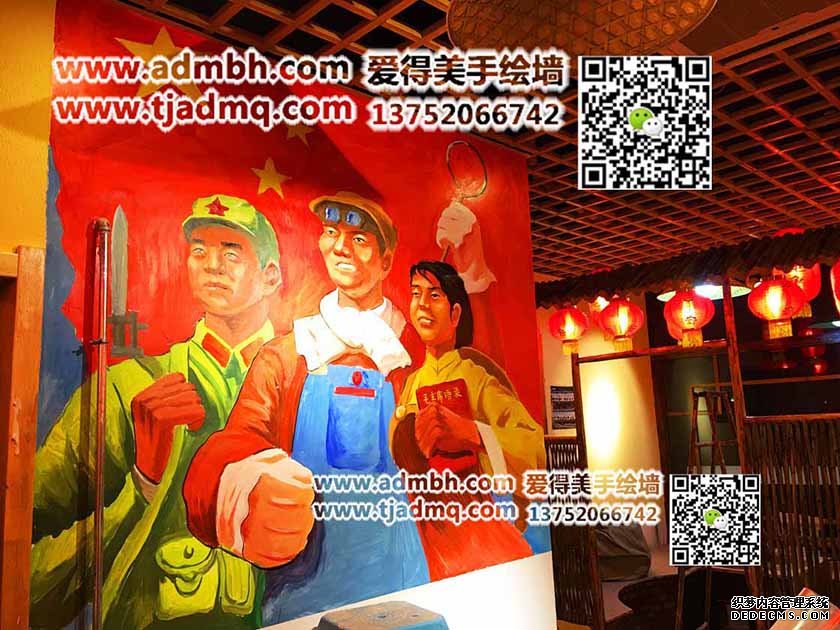 飯店老板要求天津彩繪題材為紅色革命主題,歷經兩天時間彩繪完成,客戶自己買的紅燈籠,照出來整體畫面紅彤彤,又一副墻體彩繪完成。