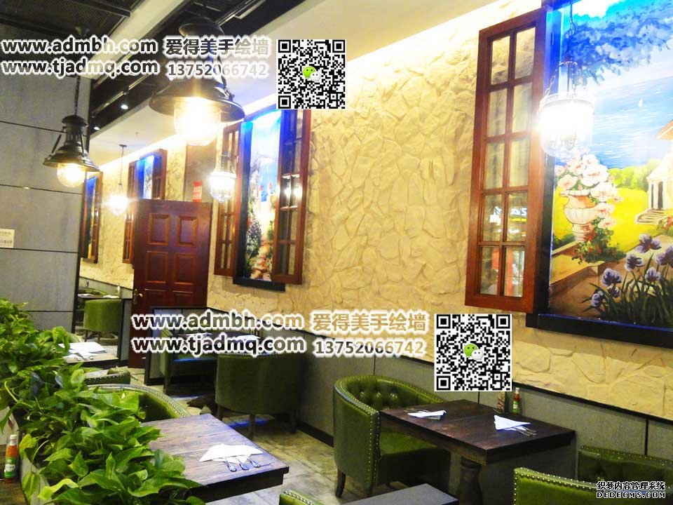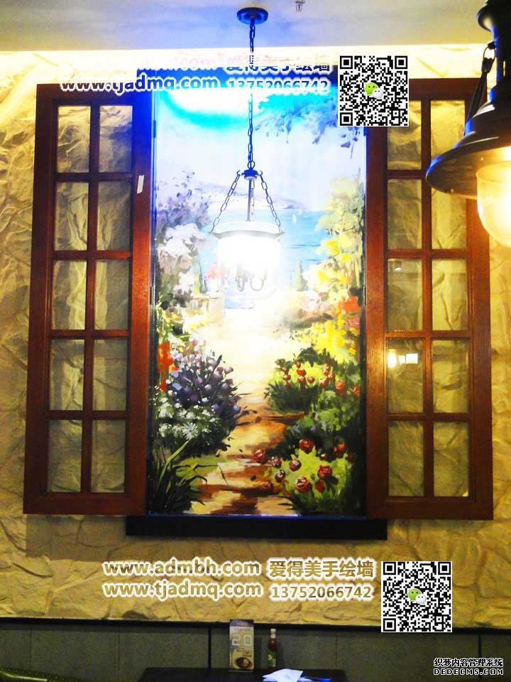 塘沽永旺豪尚豪牛排老板需要畫風景畫,在室內打開的加窗戶中間畫縱深感的風景畫。畫后墻面都是墻體彩繪效果。
